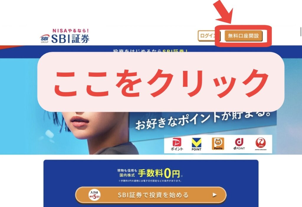 SBI証券の公式サイトにアクセスすると、画面上に 「無料口座開設」 と表示されたボタンがあります。